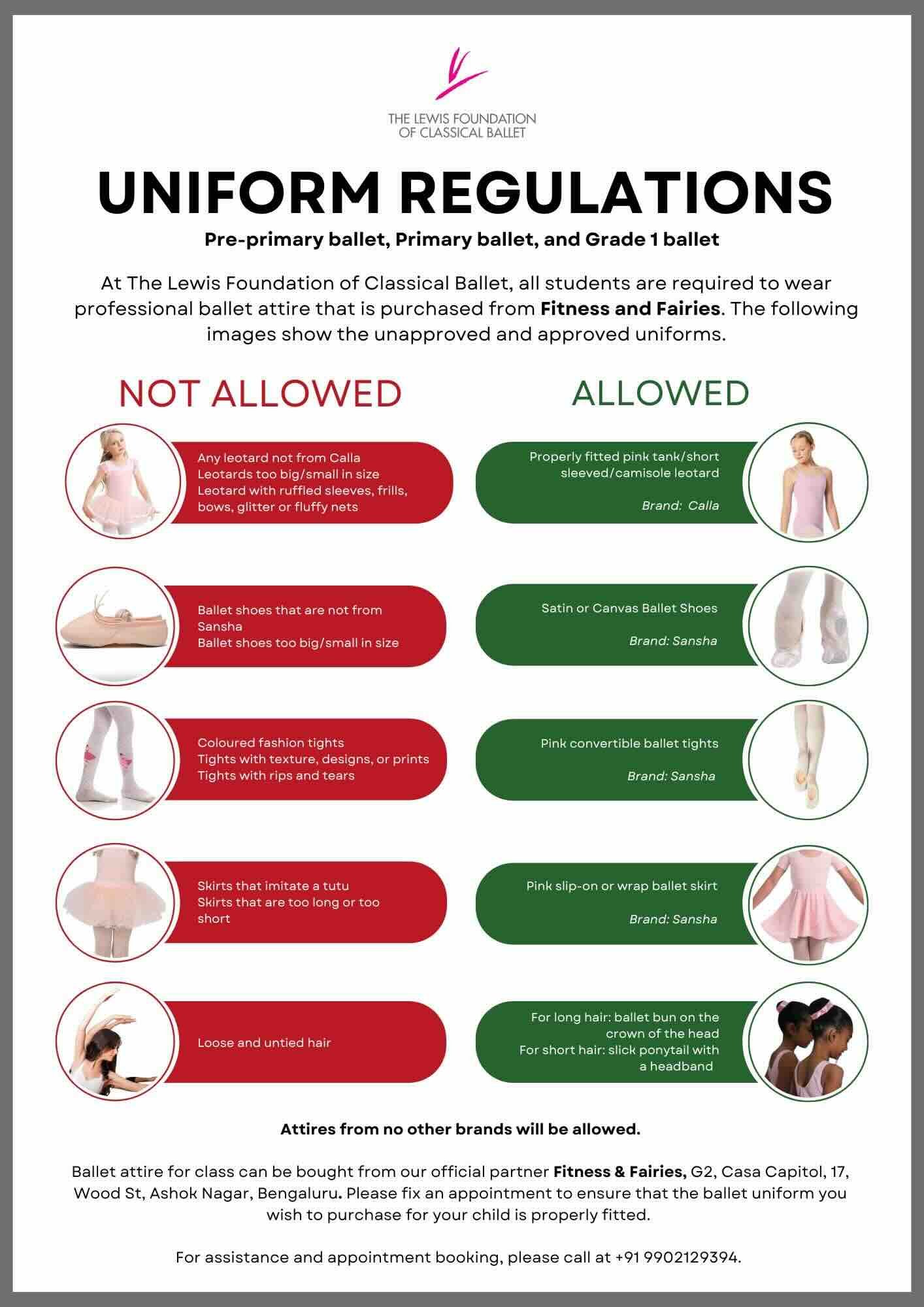 For ballet, a student will only be allowed to wear an internationally approved dance uniform purchased from Fitness and Fairies which carries brands such as Sansha, Calla, Lulli, Bloch, and Capezio. Attires and ballet shoes from any other brands will not be allowed.